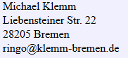 Das Copyright für veröffentlichte, vom Autor selbst erstellte Objekte bleibt allein beim Autor der Seiten. Eine Vervielfältigung oder Verwendung solcher Grafiken, Tondokumente, Videosequenzen und Texte in anderen elektronischen oder gedruckten Publikationen ist ohne ausdrückliche Zustimmung des Autors nicht gestattet.